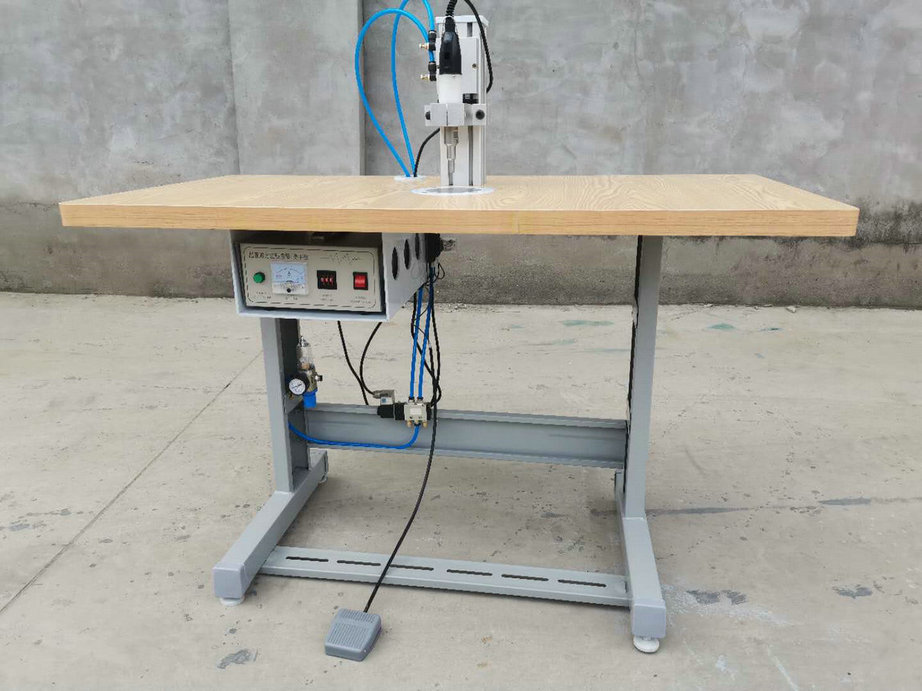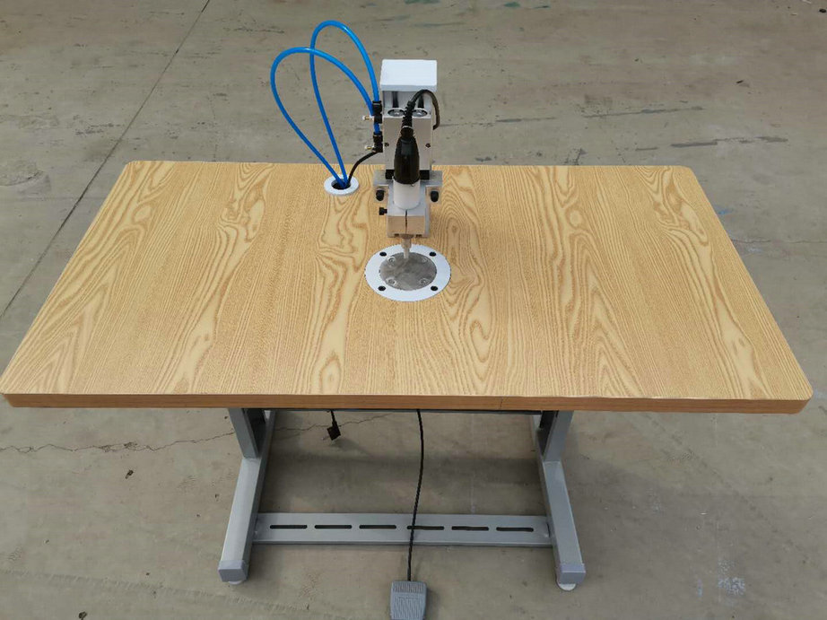 本機以超聲波將綁帶融合于口罩本體兩側,進而完成綁帶式口罩成品,只需一名操作員將口罩片置于超聲波發生器的頭上,后將綁帶放在口罩片上,腳踏踏板使氣缸向下運動,縫住綁帶和口罩片。